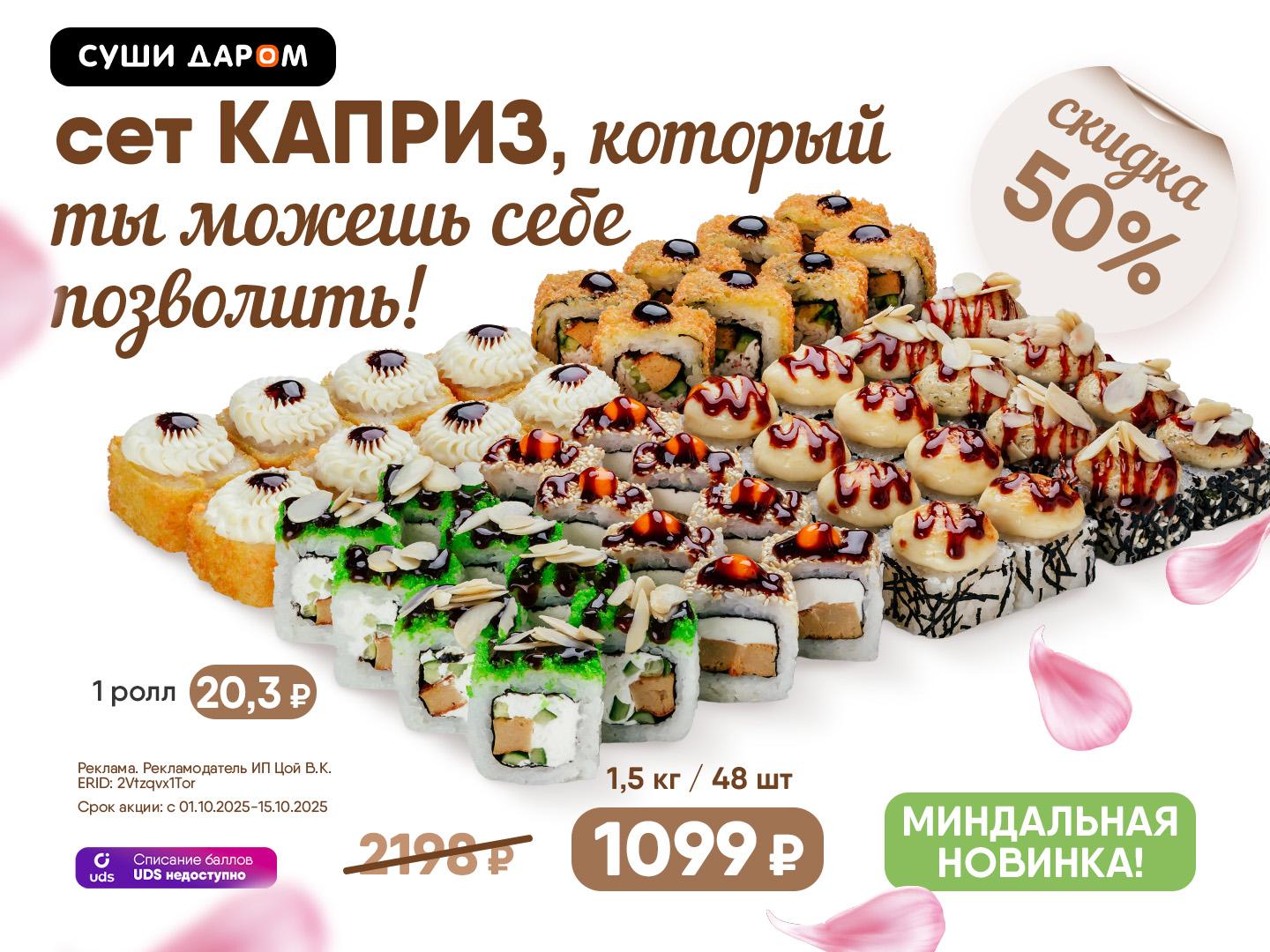 Миндальные лепестки. Мягкий вкус. Визуальное наслаждение.[br][emoji=:orange_heart:] Новый сет Каприз — это 1,5 кг эстетики и вкуса с лепестками миндаля всего за 1099 рублей.[br][br]Лёгкий хруст, сливочная нежность, вау-финиш.[br]Да, это не классика.[br]Это новый вкус, который хочется попробовать![br][br] Срок действия акции с 01.10.2025-15.10.2025[br]*Списание баллов UDS невозможно.[br]**Количество товара ограничено, наличие товара уточняйте у кассира по телефону 8 (923) 535-50-05
